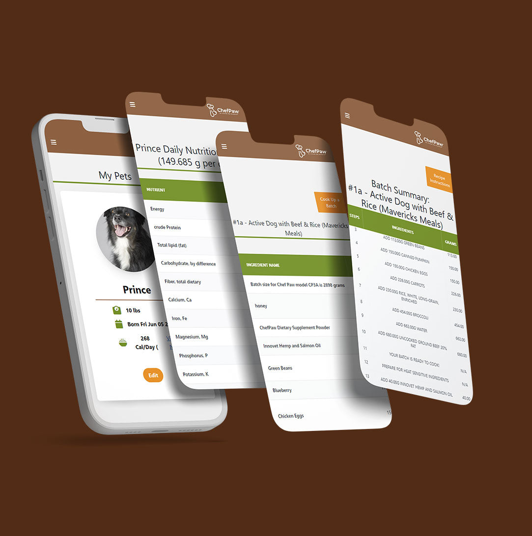 In order to go beyond AAFCO and NRC standards, we custom-developed our patent-pending ChefPaw app which tracks 68 nutrients and then compares the nutrients in a recipe with the unique profile of your pet. Size, activity level, food allergies, food intolerances, and health conditions dramatically affect the nutritional needs of each dog. The ChefPaw dog food maker, the ChefPaw app, and ChefPaw suggested recipes are the latest game-changing developments from our team of professionals at Innovet Pet Products who have been making cutting-edge pet products since 2005. Every aspect of ChefPaw is also developed with the consultation of licensed veterinarians, veterinary nutritionists, and CVFT's.